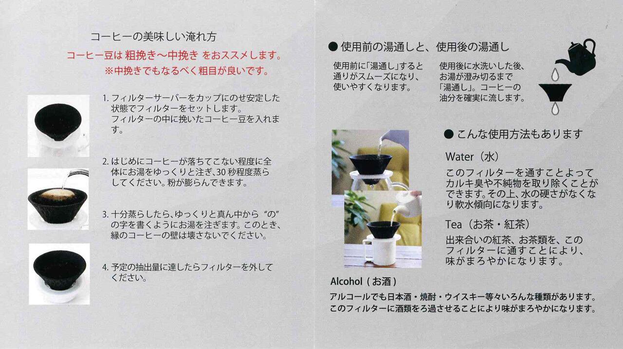 COFIL(コフィル)は50ミクロン(毛髪と同じくらい)という小さな穴が無数に空いており、水に含まれるカルキ臭や不純物を取り除きます。また、遠赤外線の効果で、コーヒーやアルコール等の飲み物が、まろやかに飲みやすくなります。